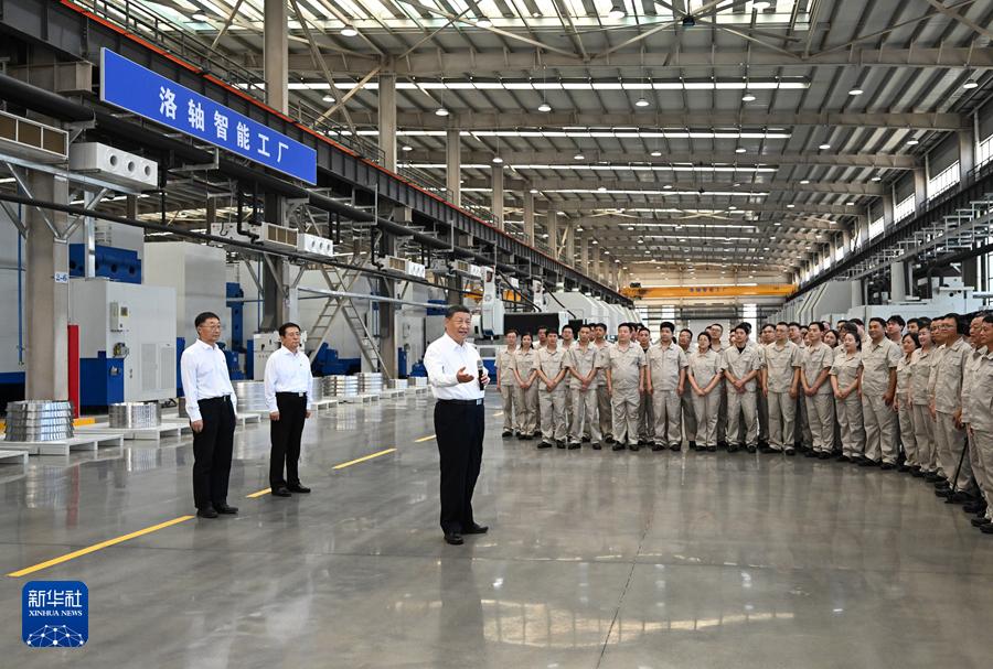 19日下午,習近平首先來到洛陽軸承集團股份有限公司考察。該公司前身為“一五”期間建成的洛陽軸承廠。在智能工廠,習近平了解企業發展歷程,聽取不同類型軸承產品用途和性能介紹,走近生產線察看生產流程。他對圍攏過來的企業職工說,制造業是國民經濟的重要支柱,推進中國式現代化必須保持制造業優勢合理比重。現代制造業離不開科技賦能,要大力加強技術攻關,走自主創新的發展路子。他勉勵職工發揚主人翁精神,在企業發展中奮發有為、多作貢獻。