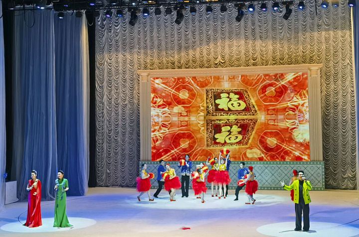 2024年2月5日,杭州歌劇舞劇院演員在土庫曼斯坦阿什哈巴德舉行的“中國文化年”閉幕式文藝演出上表演歌舞《歡樂中國年》。新華社記者 江宥林 攝