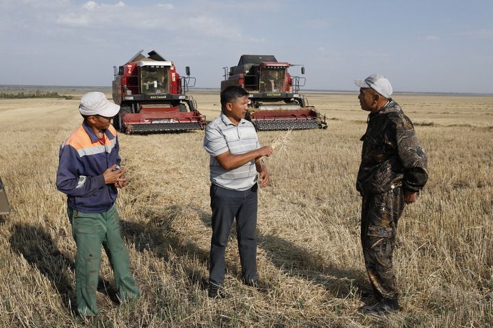 2022年9月2日,在哈薩克斯坦北哈薩克斯坦州,與愛菊集團合作的農場主在收割。新華社發(奧斯帕諾夫攝)
