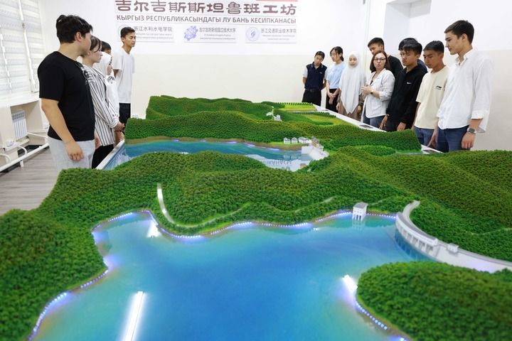 2025年6月4日,在吉爾吉斯斯坦首都比什凱克,師生在吉爾吉斯斯坦魯班工坊水利樞紐工程模擬演示實驗室學習水電站知識。新華社發(羅曼攝)