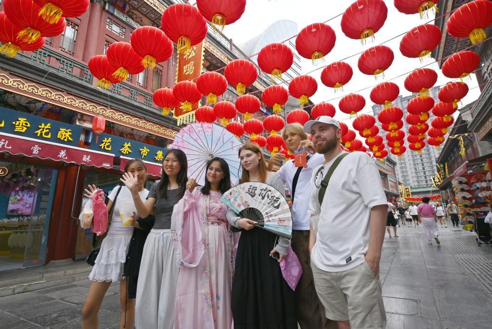 8月14日,上合組織國家學生在天津古文化街留影。新華社記者李然攝