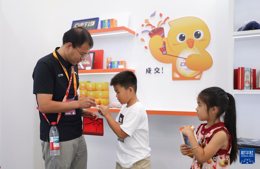 9月14日,觀眾在文旅服務展區門頭溝區展臺前選購文創產品。