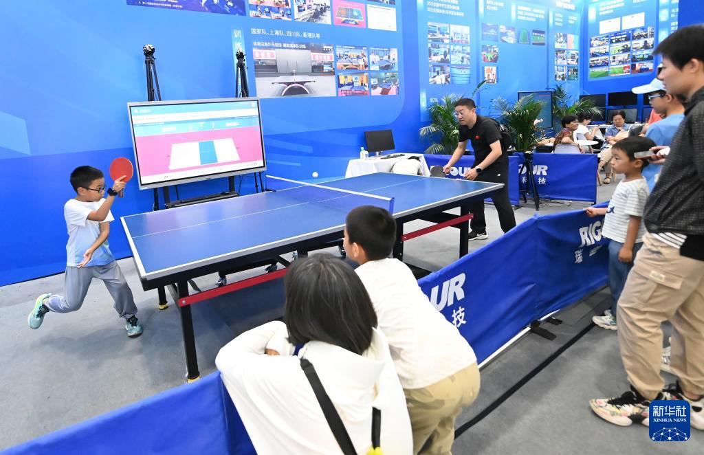 9月14日,參觀者在體育服務專題展區體驗一款科技乒乓球智能系統。
