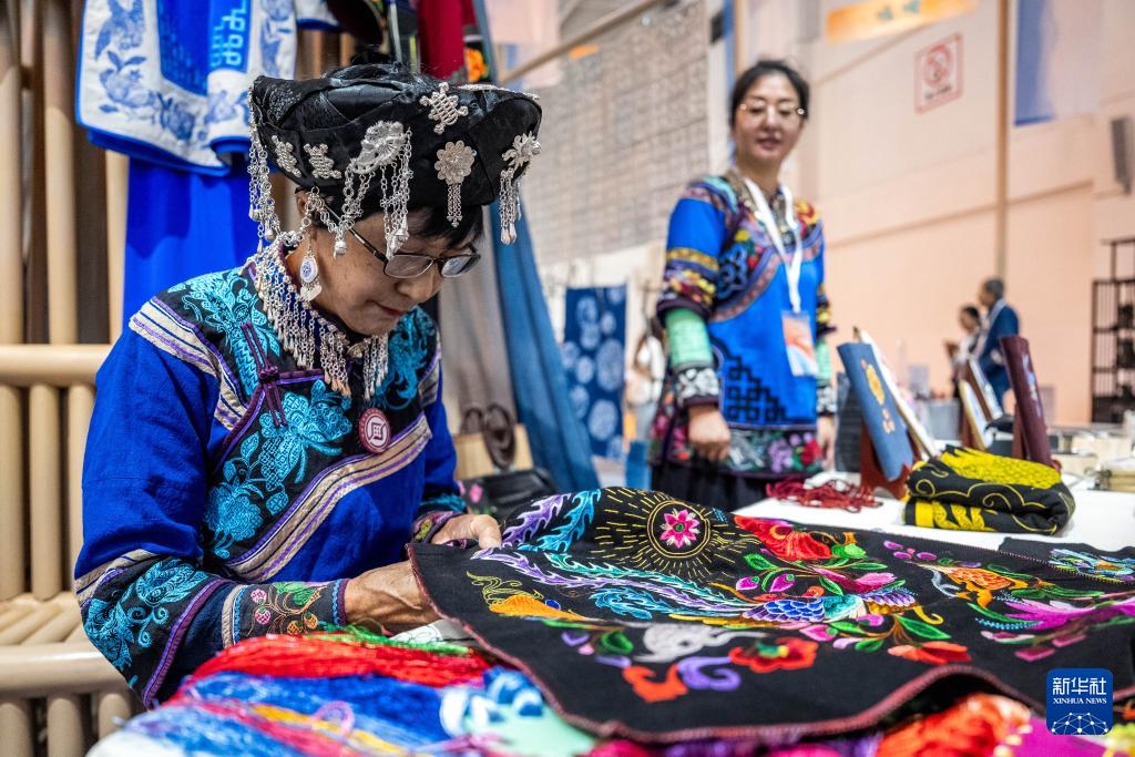 9月17日,國家級非物質文化遺產彝族(撒尼)刺繡省級代表性傳承人游定美在創意云南文化產業博覽會上刺繡。