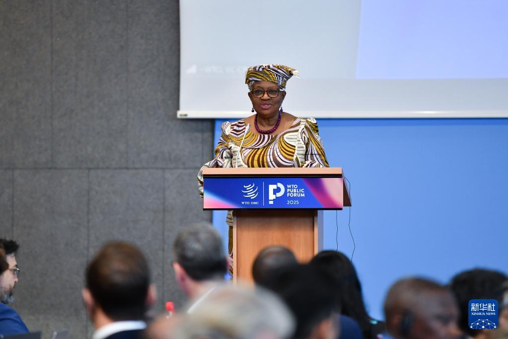 9月17日,在瑞士日內(nèi)瓦世貿(mào)組織總部,世貿(mào)組織總干事伊維拉在《2025世界貿(mào)易報(bào)告》發(fā)布會(huì)上講話。
