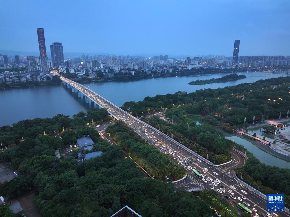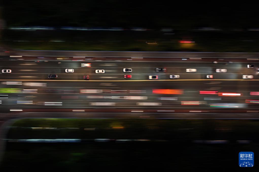 汽車行駛在廣西柳州市文昌大橋上,其中部分為柳州產的新能源汽車(9月8日攝,無人機照片)。