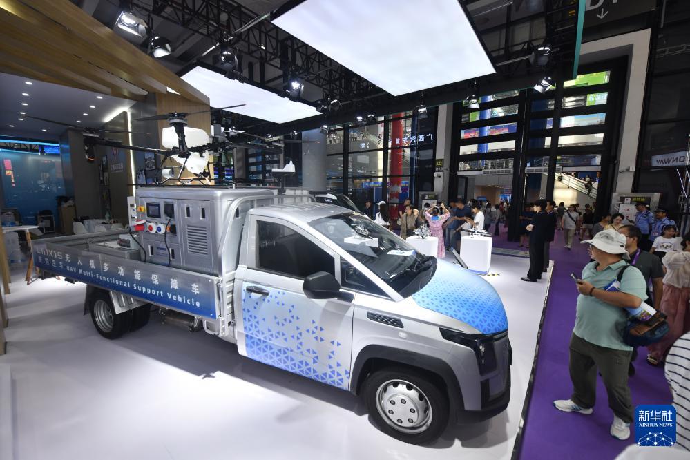 在南寧國際會展中心,觀眾參觀一款柳州產的無人機多功能保障車(9月20日攝)。