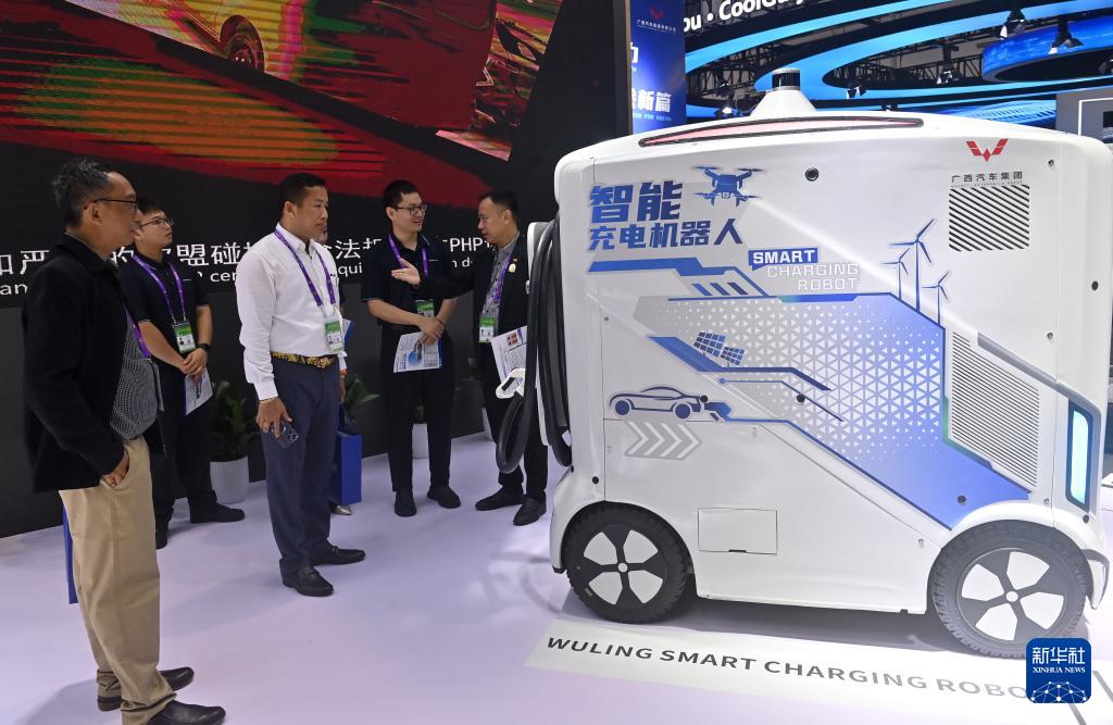 在廣西南寧國際會展中心,參觀者了解一款柳州產的智能充電機器人(9月19日攝)。