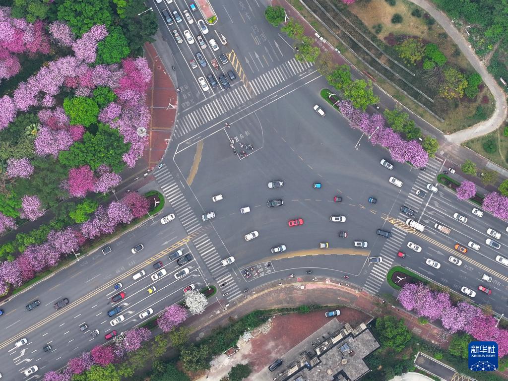 汽車行駛在廣西柳州市學院路上,其中部分為柳州產的新能源汽車(4月8日攝,無人機照片)。