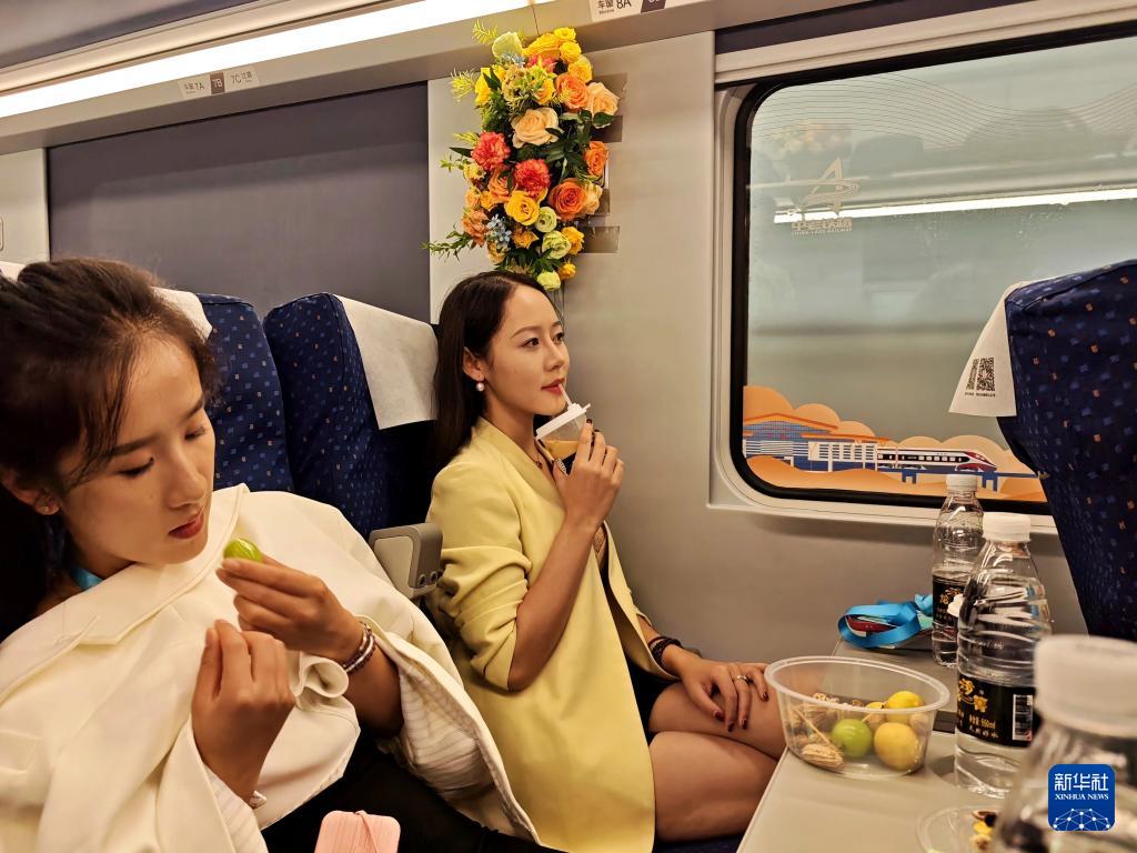 9月20日,旅客在中老鐵路列車上品嘗咖啡。