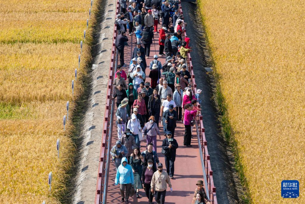 9月23日,在北大荒農墾集團閆家崗農場稻田藝術公園,人們乘坐小火車游覽。
