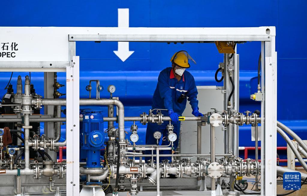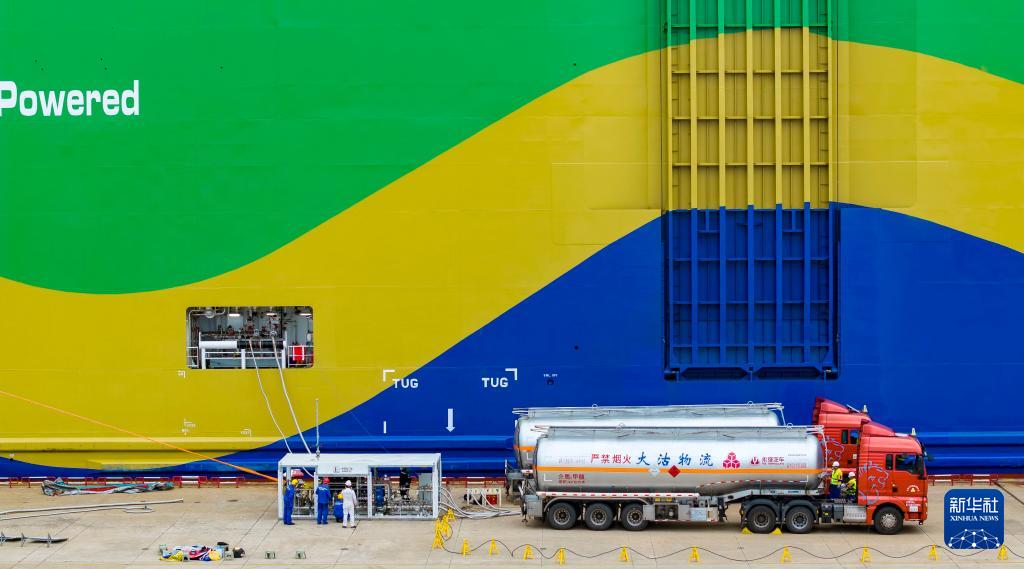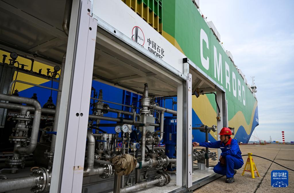 9月22日,在天津港環球滾裝碼頭,工作人員準備進行甲醇加注作業。