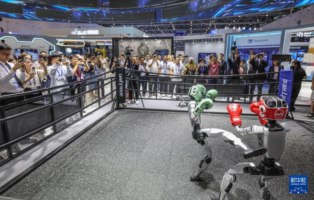 9月25日,在第四屆全球數(shù)字貿(mào)易博覽會(huì)數(shù)智未來(lái)主題展區(qū)的杭州六小龍專區(qū),宇樹科技的人形機(jī)器人在進(jìn)行格斗擂臺(tái)賽。