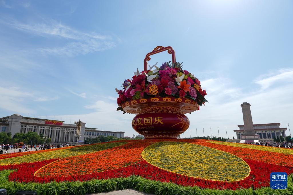 9月25日,2025年“祝福祖國”巨型花籃正式完工,亮相天安門廣場與市民共度佳節(jié)。今年“祝福祖國”花壇以喜慶的花籃為主景,花壇頂高18米,籃體高16米,籃盤直徑12米。籃體南側書寫“祝福祖國”“1949-2025”字樣,籃體北側書寫“歡度國慶”“1949-2025”字樣。籃內(nèi)選取了美好寓意的花卉,其中荷花寓意“和和美美”、橄欖枝寓意“榮耀和平”等,還結合和平鴿元素,體現(xiàn)“和平發(fā)展、欣欣向榮”。