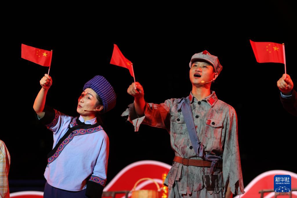 10月1日,演員在重慶市黔江區武陵水岸表演紅色情景劇《守望》。