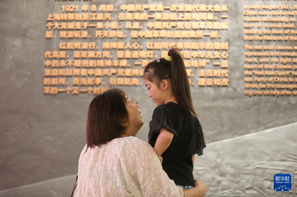 10月7日,在浙江省嘉興市南湖革命紀念館,家長為孩子講解革命歷史。