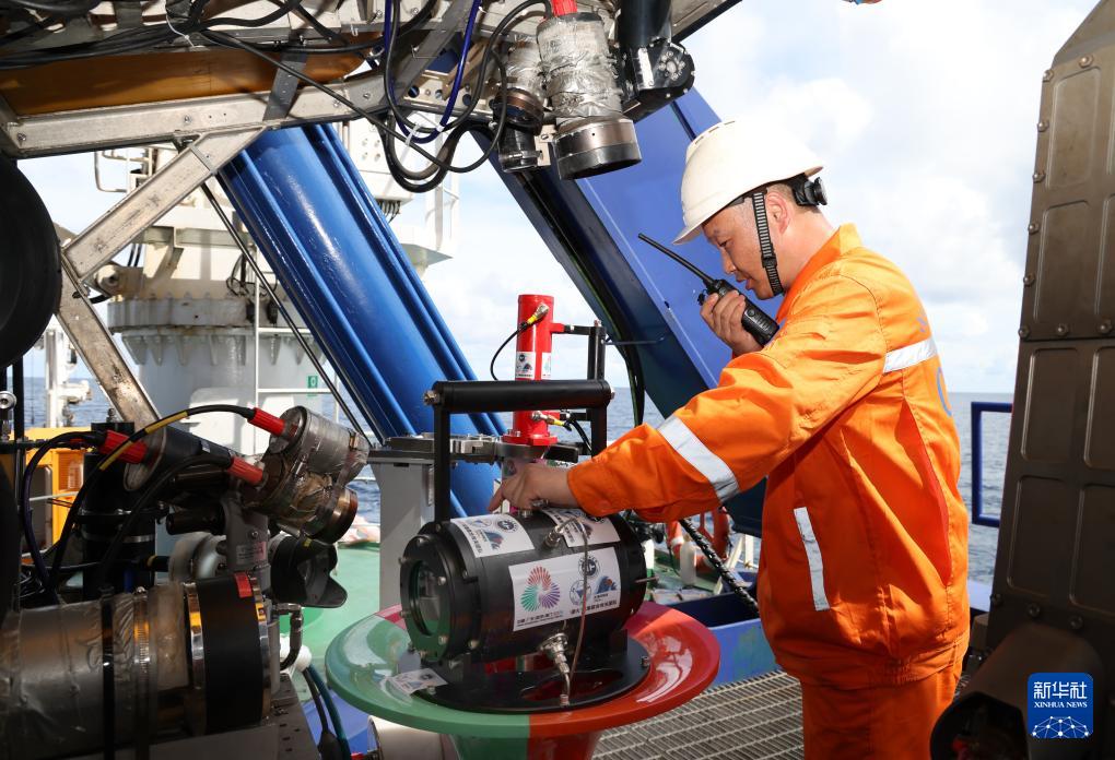 下水采集“源火”前,工作人員在調整搭載在“海馬”號深海遙控潛水器上的采火裝置(9月18日攝)。