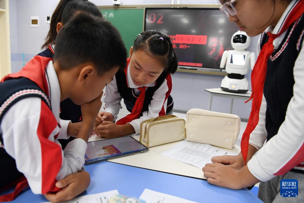 10月15日,在北京市海淀區(qū)第四實(shí)驗(yàn)小學(xué)《多彩的活動(dòng)》主題語(yǔ)文公開(kāi)課上,老師借助AI評(píng)改指導(dǎo)學(xué)生。