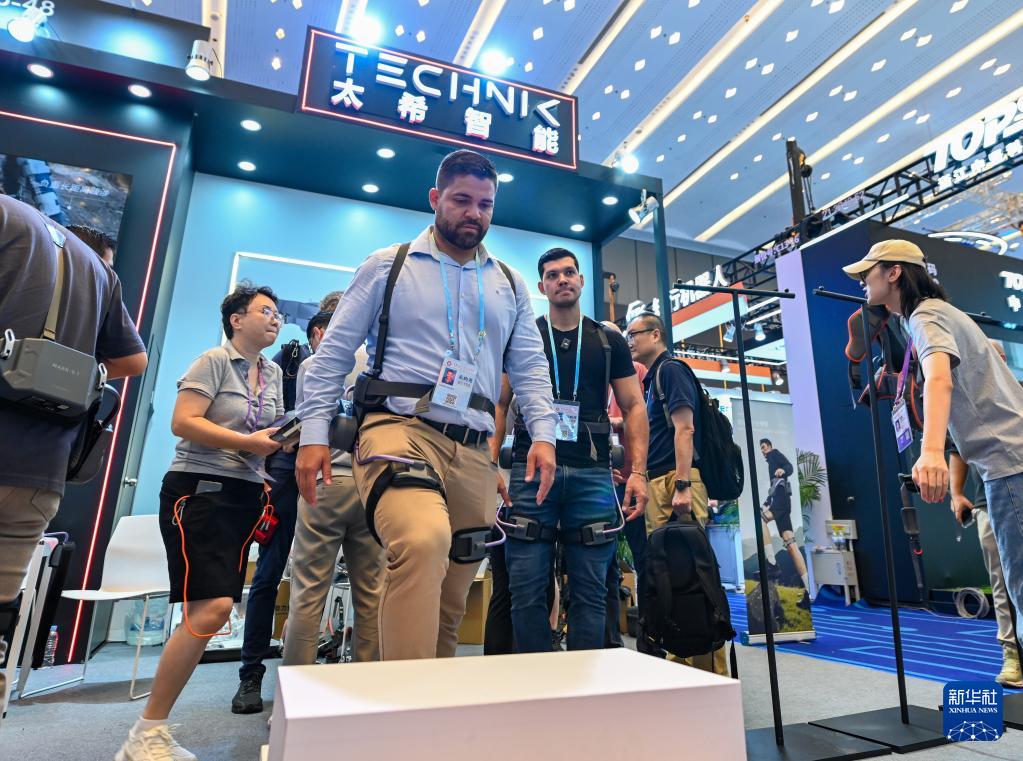 10月15日,境外采購商在第138屆廣交會服務機器人專區體驗外骨骼穿戴設備。