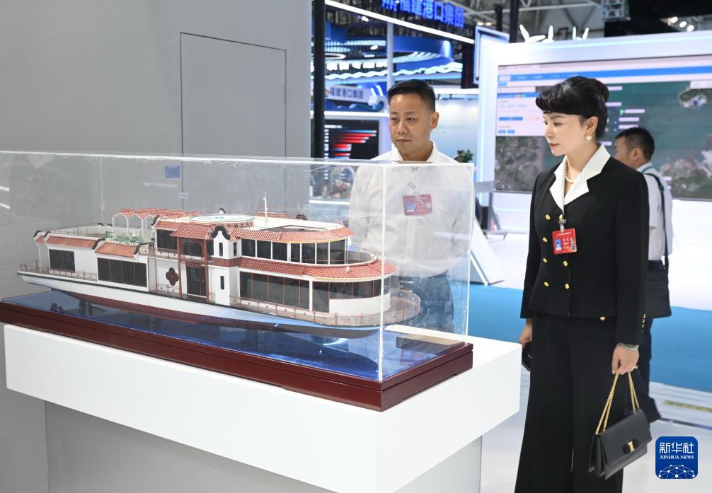 10月16日,與會人員在寧德時代展區觀看“閩江會客廳”電動游船模型。