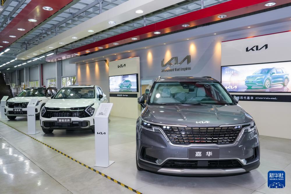 位于中韓(鹽城)產業園的江蘇悅達起亞汽車有限公司內展示的汽車(10月16日攝)。