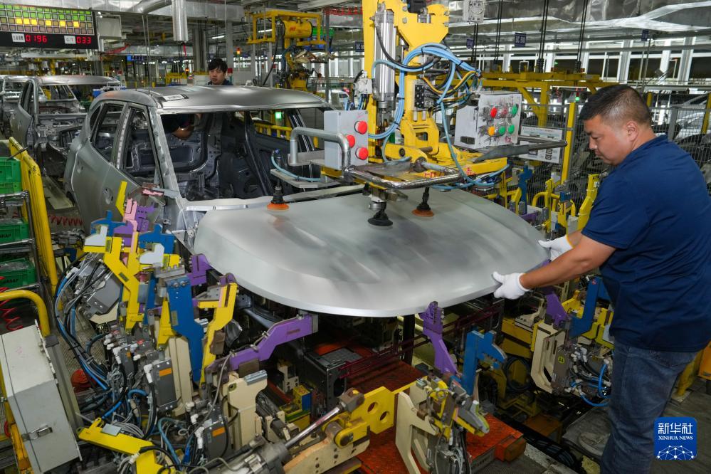 工人在佛吉亞(鹽城)汽車部件系統有限公司汽車配件生產車間內工作(9月18日攝)。