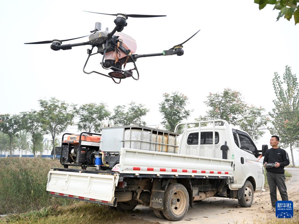 10月30日,在河南省清豐縣固城鎮(zhèn)張莊里村,農(nóng)戶在操作無(wú)人巡田機(jī)起飛。