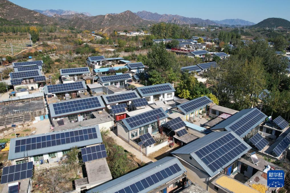 11月2日拍攝的河北省平山縣西柏坡鎮北莊村兆瓦級“光儲”智能微電網示范工程項目中的屋頂光伏發電板(無人機照片)。