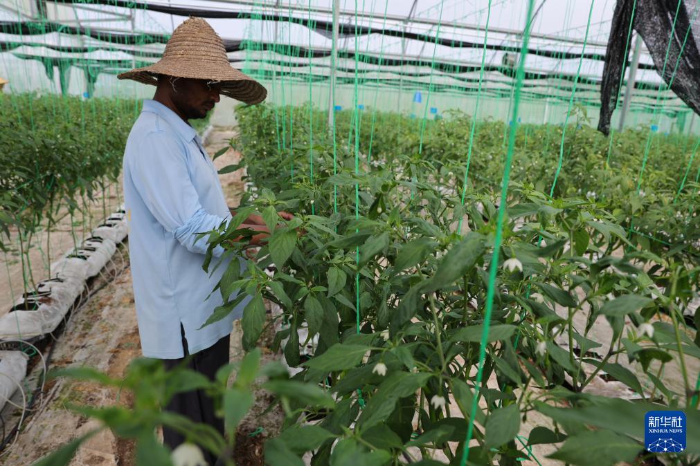 11月3日,在文萊斯里巴加灣市郊一處農業科技產業園,工作人員查看辣椒的生長情況。
