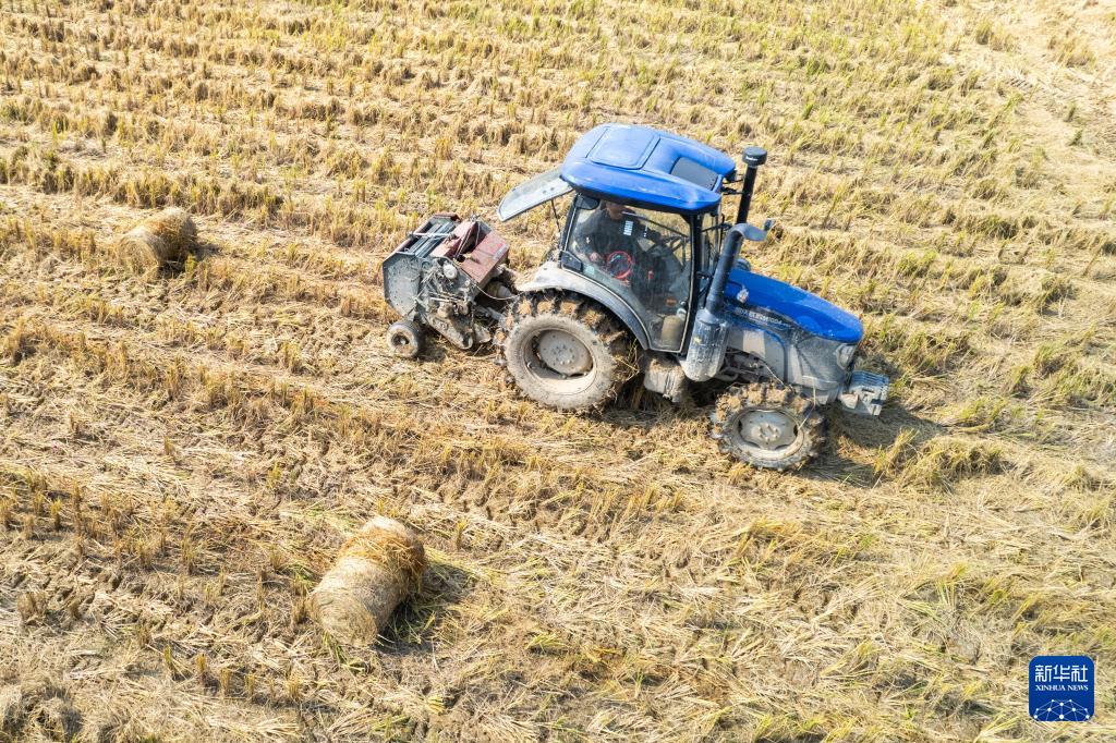 11月5日,在長沙縣開慧鎮開慧村,村民操作牽引式秸稈打捆機回收水稻秸稈(無人機照片)。
