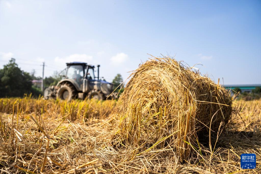 11月5日,在長沙縣開慧鎮開慧村,村民操作自走式秸稈打捆機回收水稻秸稈。