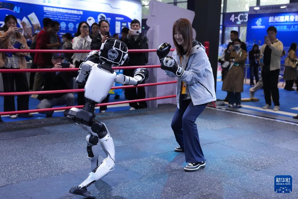 11月6日,觀眾在2025年世界互聯(lián)網(wǎng)大會“互聯(lián)網(wǎng)之光”博覽會現(xiàn)場體驗(yàn)與宇樹科技G1機(jī)器人“格斗”。