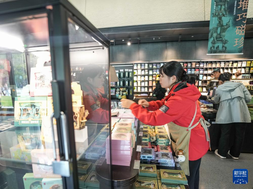 在四川省廣漢市三星堆博物館文創商店,工作人員往貨架上補充文創產品(10月30日攝)。