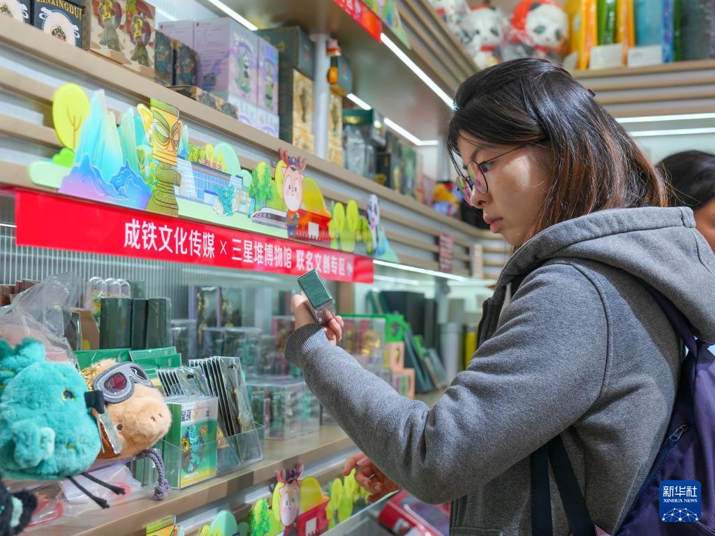 游客在四川省廣漢市三星堆博物館內的文創商店選購文創產品(10月30日攝)。
