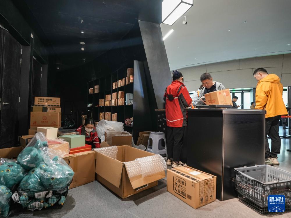 在四川省廣漢市三星堆博物館文創商店,現場快遞點工作人員將游客選購的文創產品打包發貨(10月30日攝)。