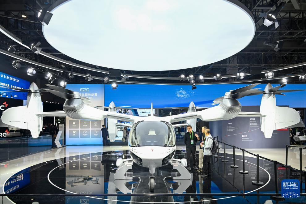 11月6日,在第八屆進博會汽車及智慧出行展區的科技展臺,展商(中)在向觀眾介紹E20 eVTOL電動垂直起降飛行器。