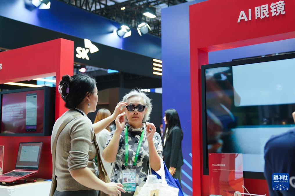 11月6日,參觀者在國家會展中心(上海)技術裝備展區高通公司展臺試戴一款AI眼鏡。