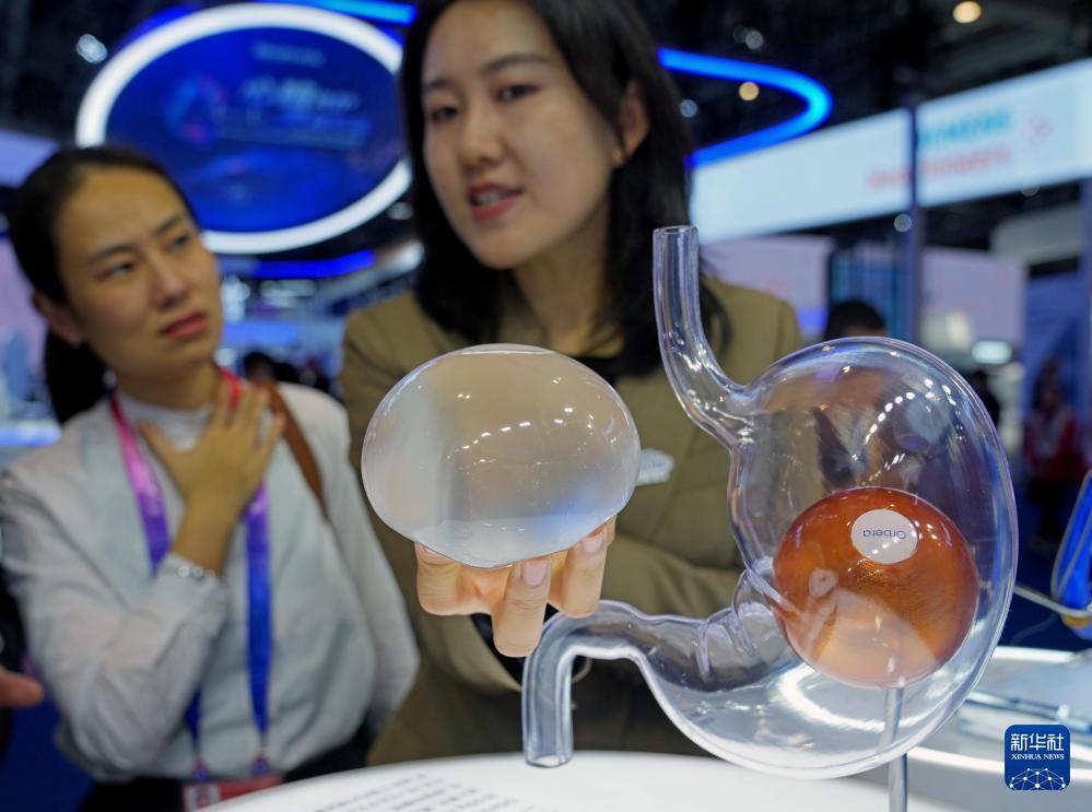 11月6日,在第八屆進博會醫療器械與醫療保健展區,工作人員在介紹減重創新產品Orbera365胃內球囊,可通過內窺鏡從口腔送入胃內以占據胃容積,減少患者進食量,增強飽腹感,以實現減重。