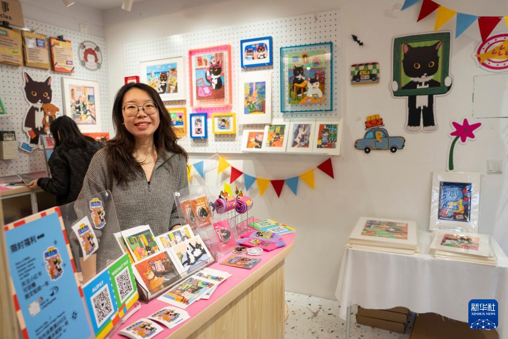 11月12日,在上海市長寧區愚園路的故事商店,工作人員展示文創產品。愚園路故事商店是由街道支持打造的10平方米特色空間,街道免費提供沿街鋪面,將其打造成居民情感交流的“解憂雜貨鋪”。