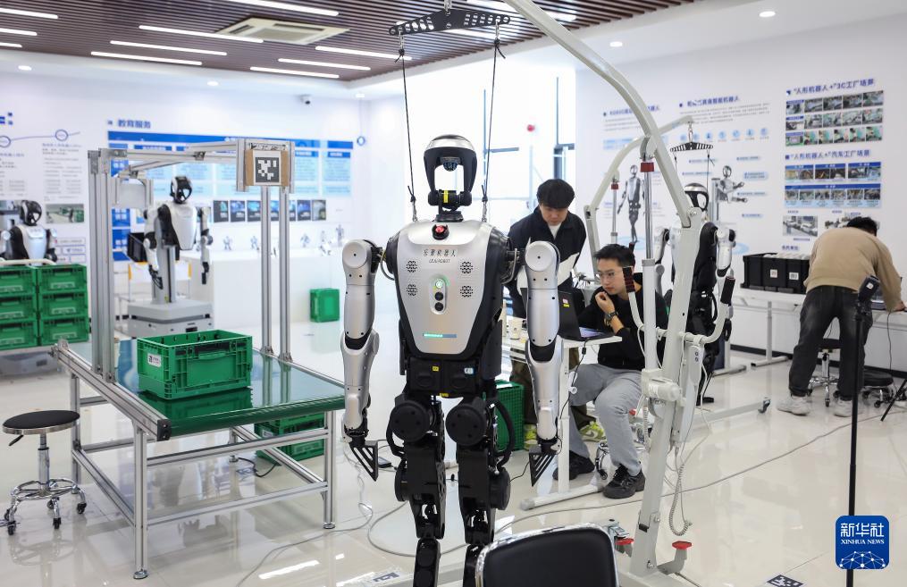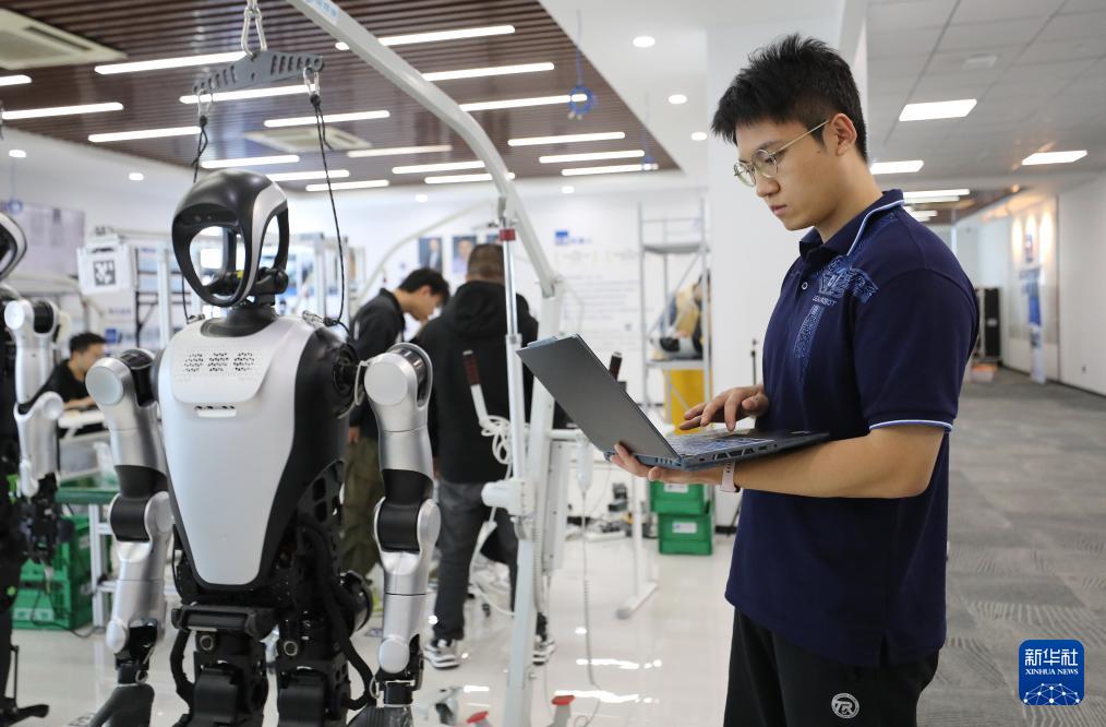 10月24日,在合肥樂聚機器人技術有限公司,工作人員在查看人形機器人的測試數(shù)據(jù)。新華社記者 杜瀟逸 攝