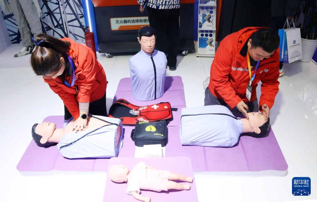 11月18日,工作人員在展覽現(xiàn)場向觀眾演示緊急救護(hù)方法。