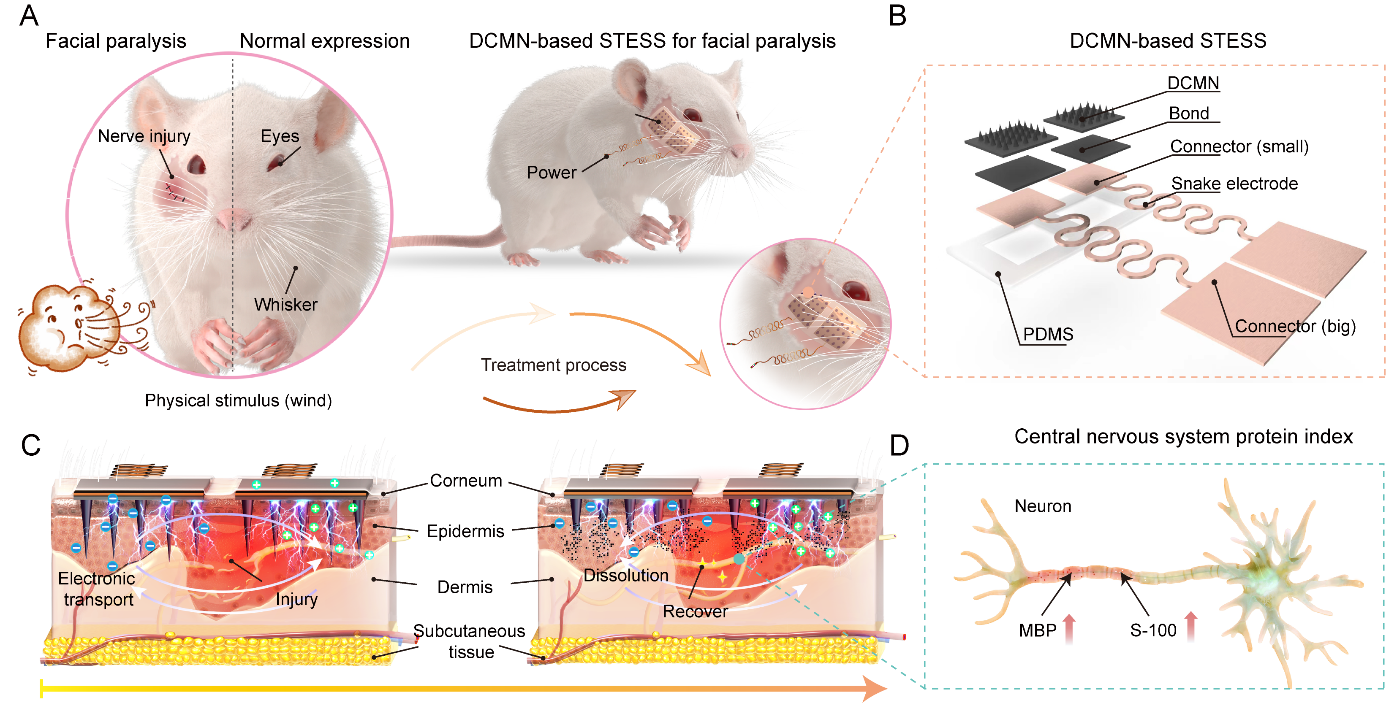 記者從中國康復研究中心獲悉,該中心口腔科副教授王興與北京大學第三醫院副研究員袁作楹、北京大學研究員黃建永等科學家合作,開創性地提出利用可溶解導電微針技術實現面神經的精準電刺激,為面癱等面神經損傷康復提供全新解決方案。相關研究成果近日發表于《生物活性材料》。
