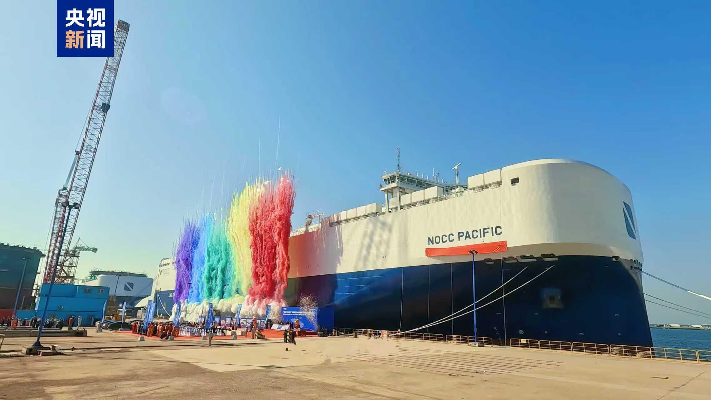 14日,擁有7000個車位的液化天然氣雙燃料動力汽車運輸船“太平洋號”(“NOCC PACIFIC”)在山東煙臺建造完工。