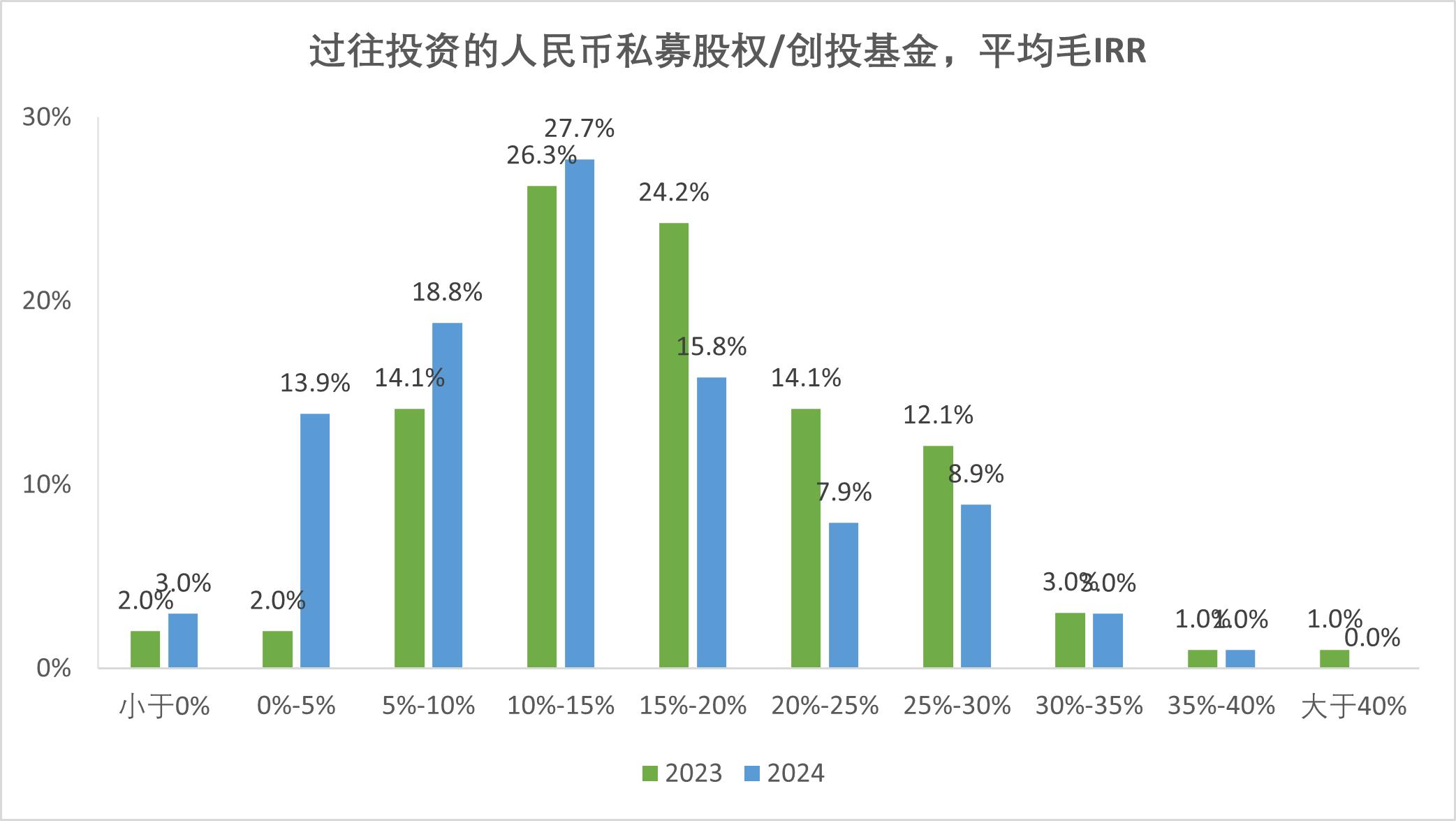 調(diào)研結(jié)果顯示,IRR主要集中在5%-20%區(qū)間(63.4%),仍有16.8%的機(jī)構(gòu)IRR低于5%,人民幣基金業(yè)績(jī)分化明顯;44.6%預(yù)測(cè)新基金IRR將下降。