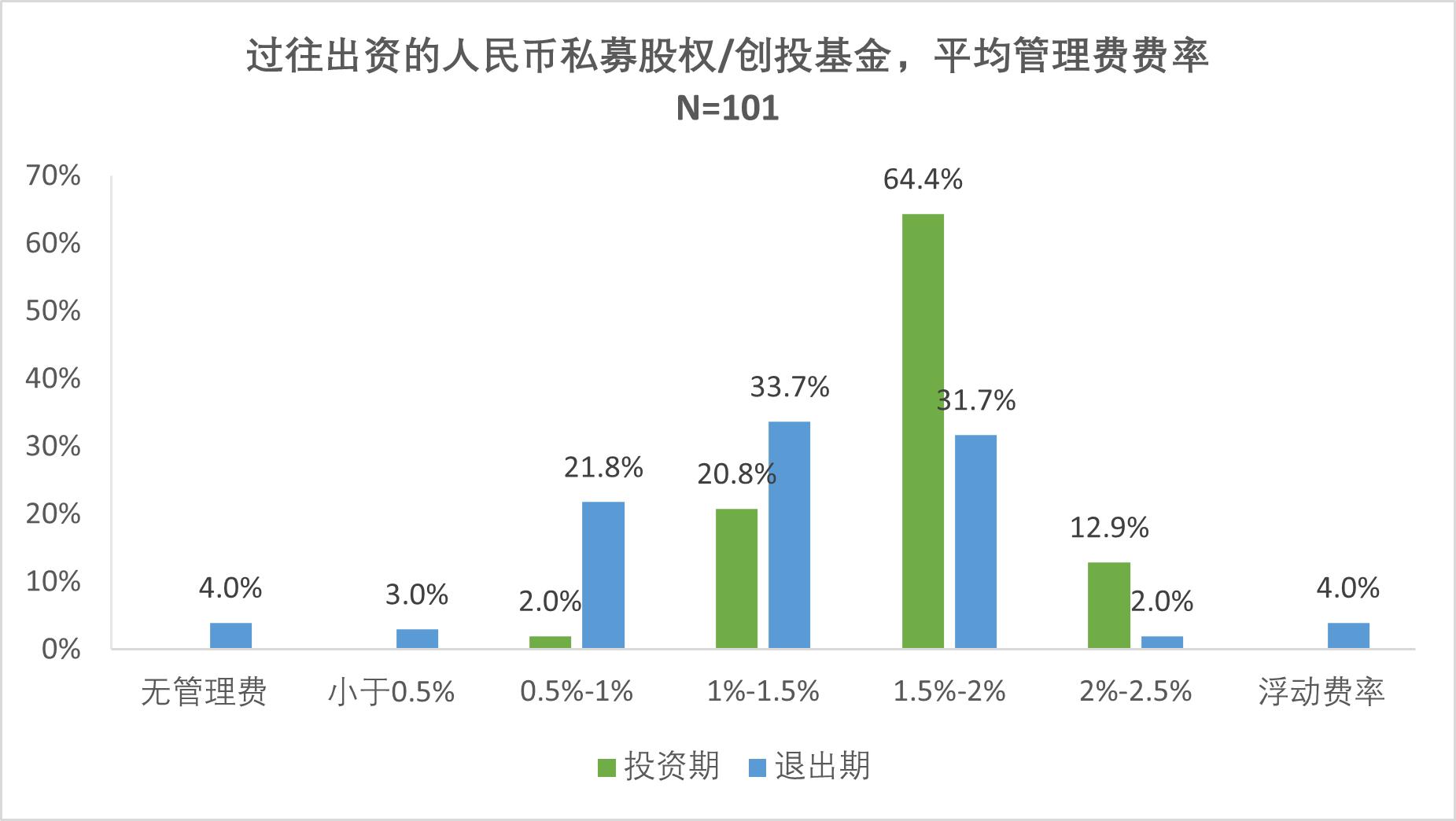 調(diào)研結(jié)果顯示,近七成(69.3%)機(jī)構(gòu)按實(shí)繳規(guī)模收1.5%-2%管理費(fèi),退出期轉(zhuǎn)未退出本金基數(shù)(54.5%)且費(fèi)率降至0.5%-1.5%,體現(xiàn)“按實(shí)際服務(wù)收費(fèi)”原則,84.2%的LP認(rèn)可現(xiàn)行水平;近六成(54.5%)機(jī)構(gòu)設(shè)7%-8%門(mén)檻收益,超六成(64.1%)機(jī)構(gòu)配追補(bǔ)機(jī)制,超額分成15%-20%成主流,超七成(71.3%)機(jī)構(gòu)采用歐式瀑布分配,為“本金安全墊+超額激勵(lì)”的經(jīng)典架構(gòu)。人民幣VC/PE市場(chǎng)費(fèi)用與分配機(jī)制已形成高度標(biāo)準(zhǔn)化體系,體現(xiàn)出風(fēng)險(xiǎn)共擔(dān)、績(jī)效導(dǎo)向的成熟市場(chǎng)特征。