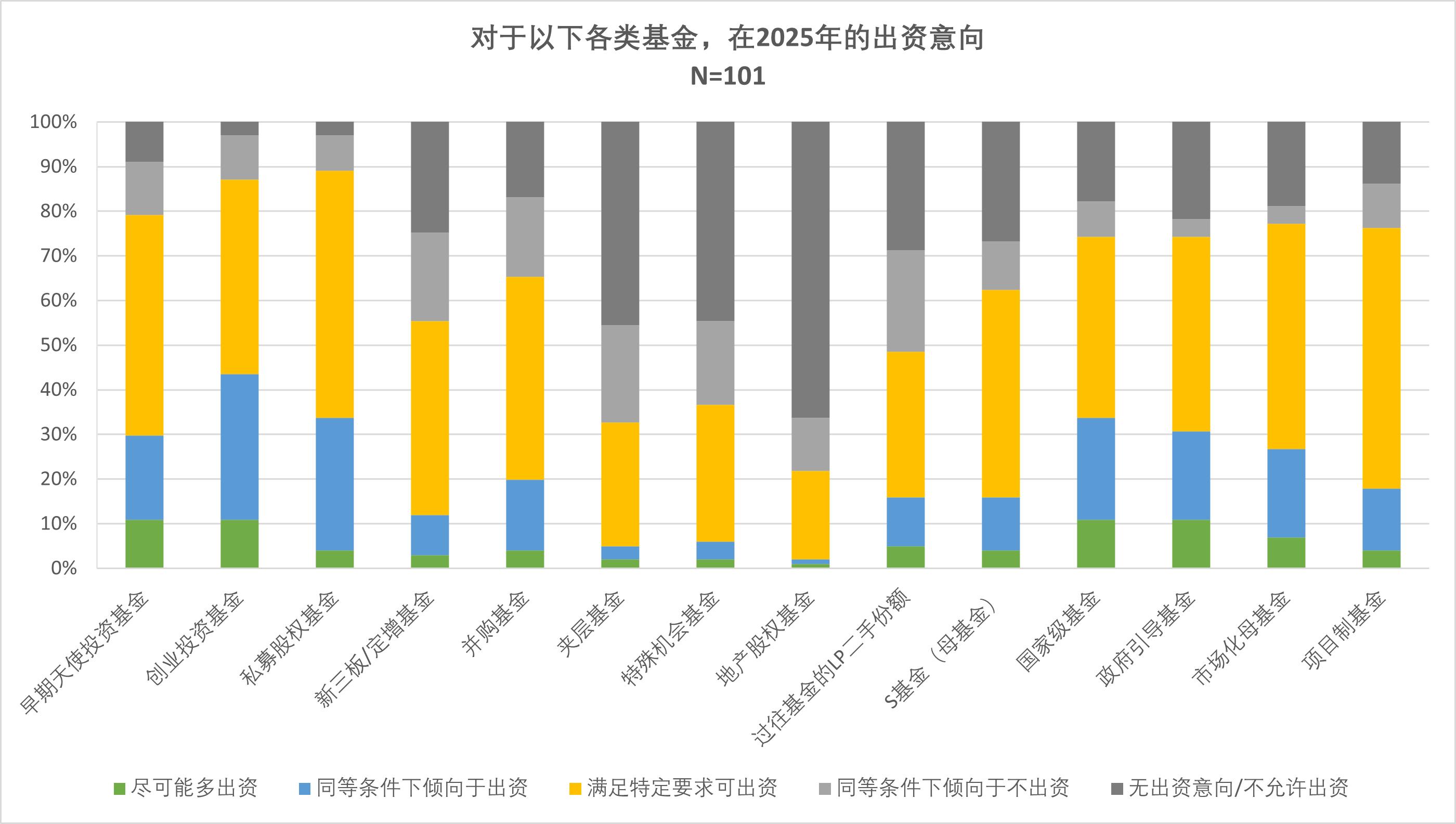 本次調(diào)研問(wèn)卷題目共101題,涵蓋了政府引導(dǎo)基金、央企/國(guó)企、險(xiǎn)資、家族辦公室等101家機(jī)構(gòu)LP。以下為調(diào)研結(jié)果發(fā)現(xiàn):