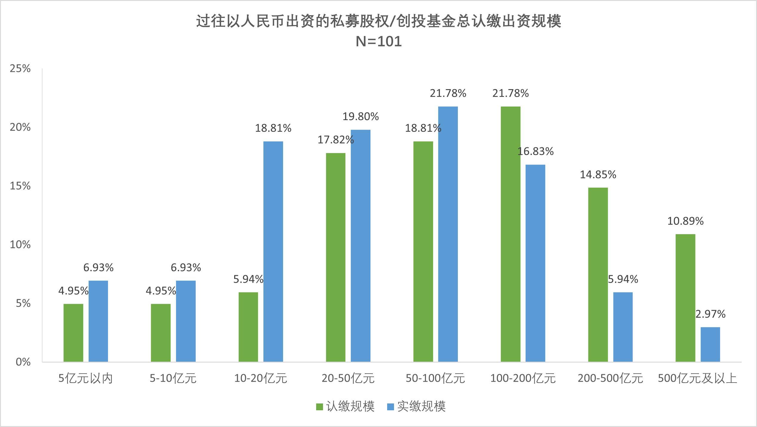 調(diào)研結(jié)果顯示,近半數(shù)(47.5%)機(jī)構(gòu)認(rèn)繳規(guī)模超100億元,其中11家機(jī)構(gòu)認(rèn)繳規(guī)模達(dá)500億元以上,但實(shí)繳規(guī)模超100億元的機(jī)構(gòu)占比不足三成(25.7%),反映出部分大額承諾資金尚未完全到位,存在顯著的“認(rèn)繳-實(shí)繳”資金到位缺口,機(jī)構(gòu)募資環(huán)境承壓,行業(yè)出清加速。