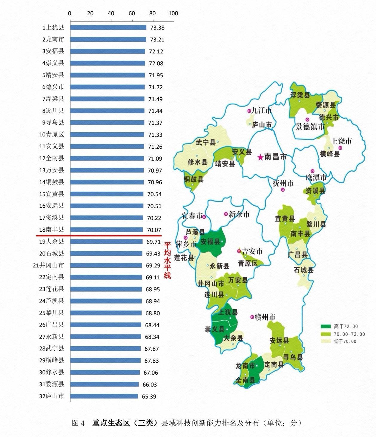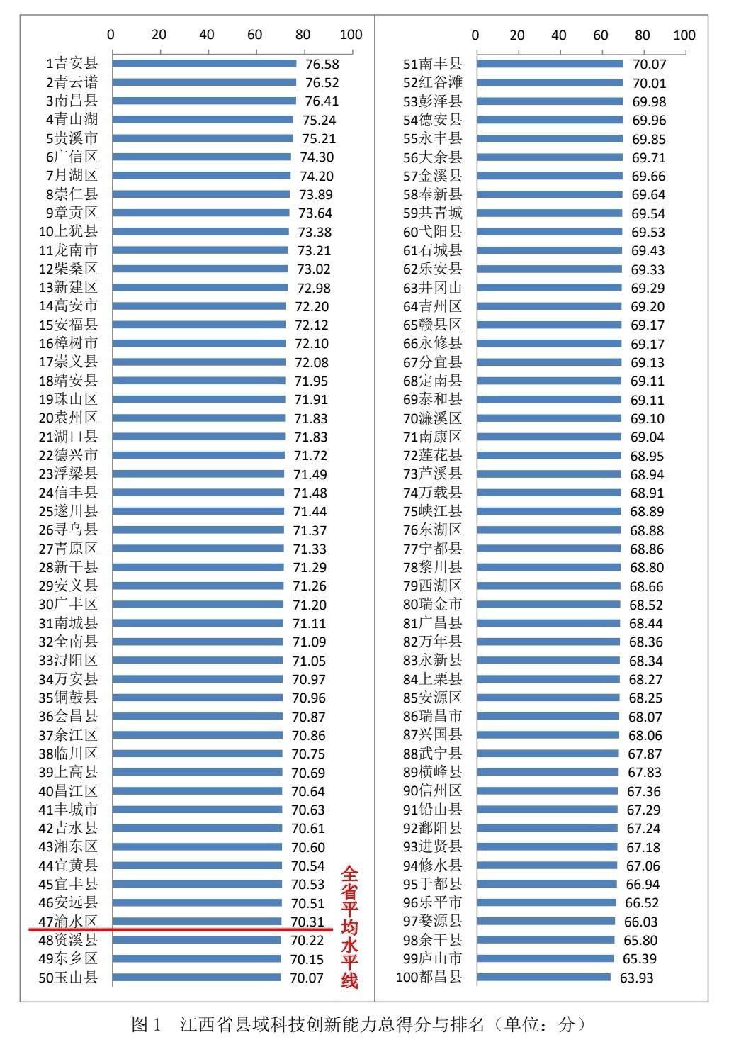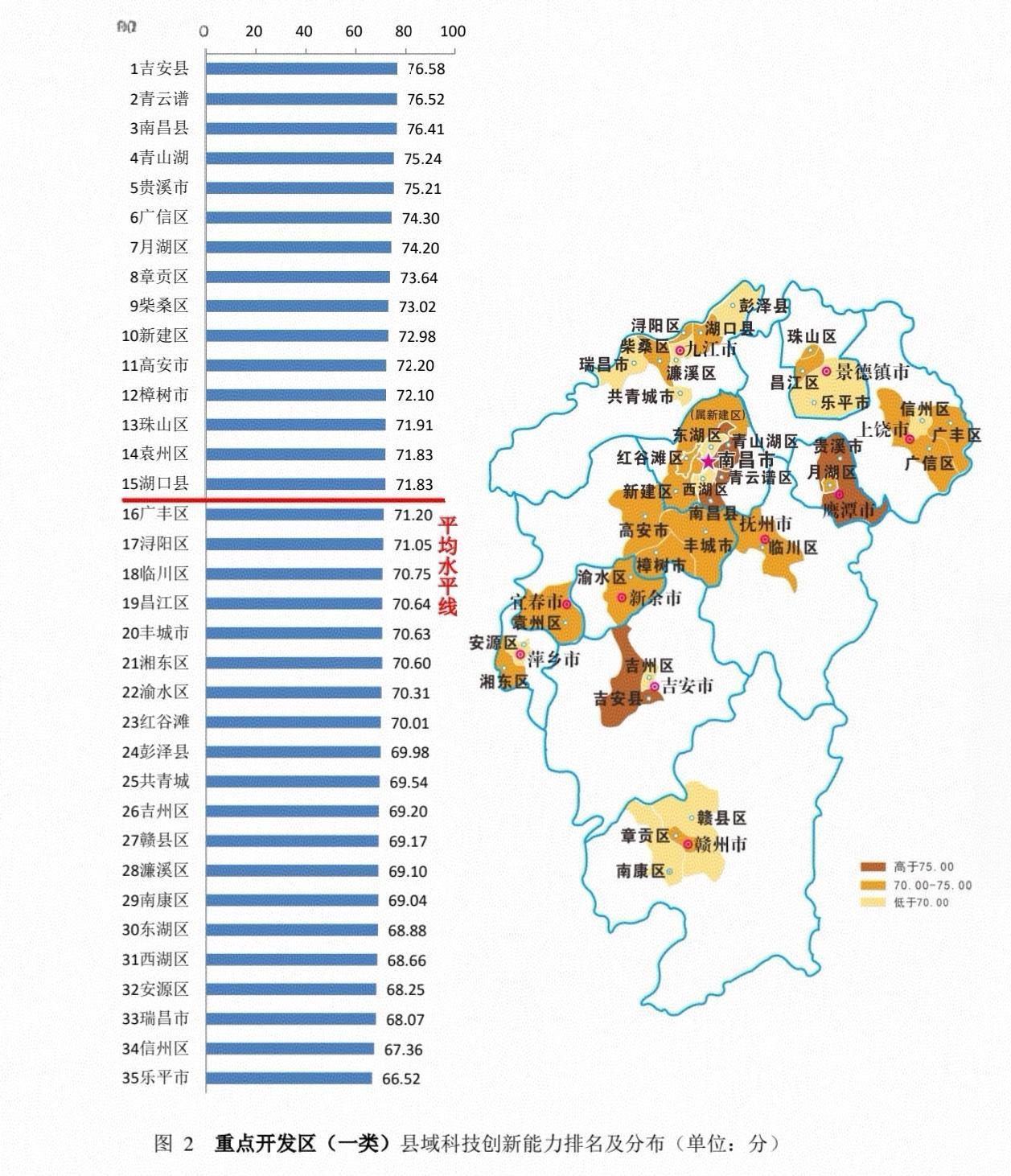 從本次評價結果來看,2024年度江西全省縣域科技創新能力平均得分為70.23、較2023年度提高0.28,平均得分以上的縣(區、市)有47個、較上一年增加2個,得分最高的三個地區依次是吉安市吉安縣、南昌市青云譜區、南昌市南昌縣。