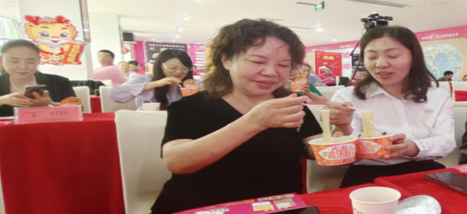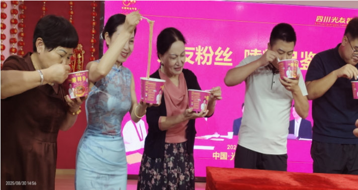 “嗦粉大賽,現在開啟!”主持人話音剛落,數十名參賽嘉賓迅速上場,面前擺放著光友低Gi酸辣粉;臺下嘉賓席,工作人員同步端上光友酸辣粉mini杯,臺上臺下形成“同步嗦粉”的熱鬧場景。哨聲響起,臺上選手專注角逐,有人用筷子高高挑起粉絲、有人用筷子快速卷粉入口、有人小口快咽確保湯汁不灑,全程嚴守“用時最短、碗底無湯”標準;臺下嘉賓邊品嘗邊關注比賽,偶爾與身旁人交流:“你試試這個酸辣粉,嚼著有紅薯的綿甜”“酸辣粉的紅油飄香”,輕聲討論與臺上的細微吞咽聲交織,氛圍鮮活。