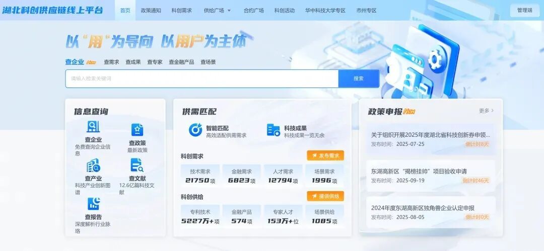 湖北科創(chuàng)供應(yīng)鏈平臺(tái)是湖北重點(diǎn)打造的科技創(chuàng)新資源與產(chǎn)業(yè)需求高效對(duì)接平臺(tái)。平臺(tái)聚焦“天網(wǎng)”“地網(wǎng)”“政策網(wǎng)”“金網(wǎng)”建設(shè),線上平臺(tái)訪問量已突破2900萬(wàn)次,入駐用戶約11.5萬(wàn)個(gè),完成超1.8萬(wàn)項(xiàng)供需匹配,為科創(chuàng)企業(yè)提供技術(shù)、金融等全要素服務(wù)。